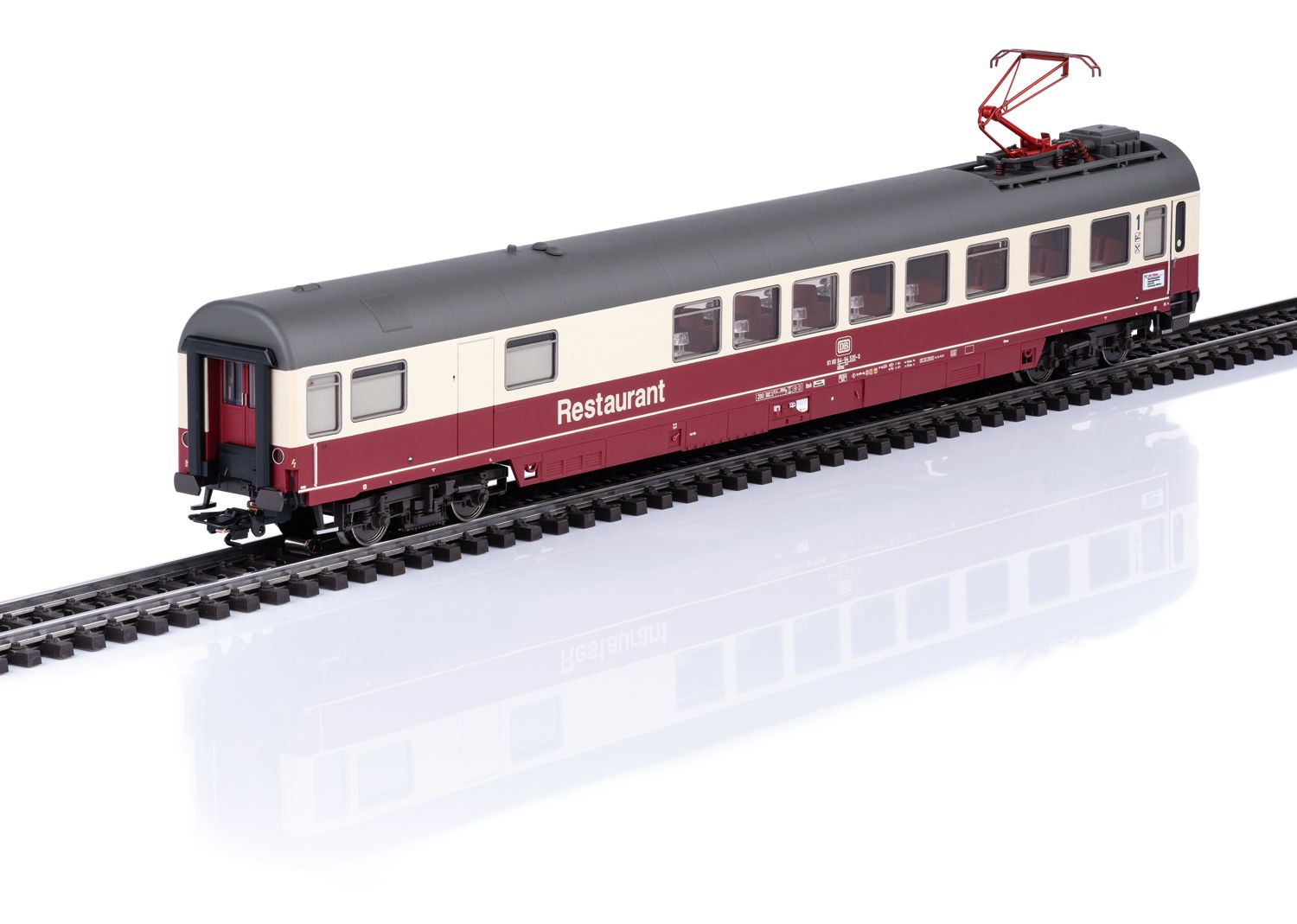 Model: The type ARmz 211.0 half dining car is partially new tooling and includes a built-in mfx digital decoder and extensive light and sound functions. Table lamps, open seating area lighting, dining area lighting, and galley/bar lighting can be controlled separately in digital operation. The interior details are multi-colored. All the cars have factory-installed LED interior lighting. A buffer capacitor is built into each car to bridge over temporary spots without current. The cars are equipped with operating, current-conducting close couplers. The interior lighting works in conjunction with the dining car. The assigned order of the cars must be maintained for this purpose. The interior lighting for the entire car consist can be turned on and off digitally using the decoder in the dining car. The interior lighting is turned on in conventional operation. The trucks, roof shapes, side walls, underbodies, and skirting are specific to the types of cars. One type Bpmz 291.2 open seating car has factory-installed marker lights. The car route signs and sequence numbers are imprinted on the cars. Toilet downpipes for the dining car are included separately for installation on this car. The minimum radius for operation is 360 mm / 14-3/16". All the cars are individually packaged and there is also a master package. Length over the buffers approximately 84.6 cm / 33-5/16".