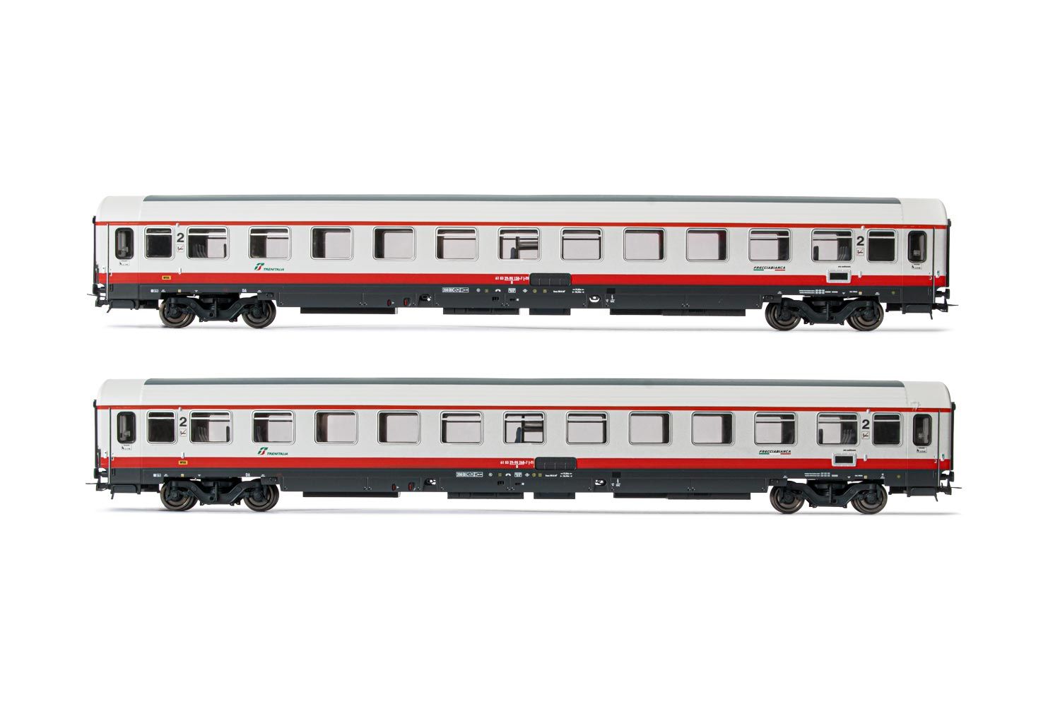 Shopping Rivarossi HR 4283 FS, 2-unit pack passenger coaches type UIC-Z renovated (progetto 901/300) in "Frecciabianca"-livery, contains two 2nd class coaches, period VI