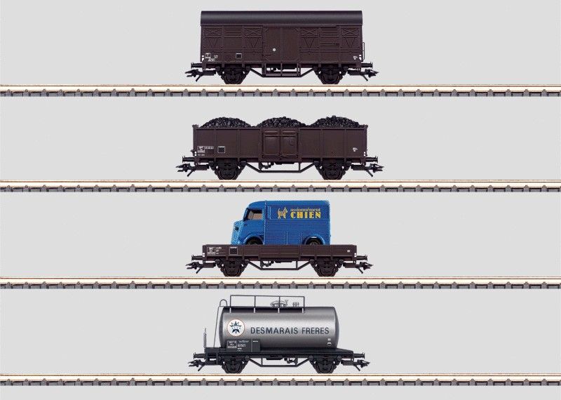 Prototipo: 4 carri merci classici delle Ferrovie dello Stato Francesi (SNCF). Carro merci chiuso tipo K. Carro a sponde alte tipo Tow per il trasporto di carbone. Carro cisterna tipo SCw. Carro a sponde basse tipo Qw per il trasporto di un autofurgone Citroën H.