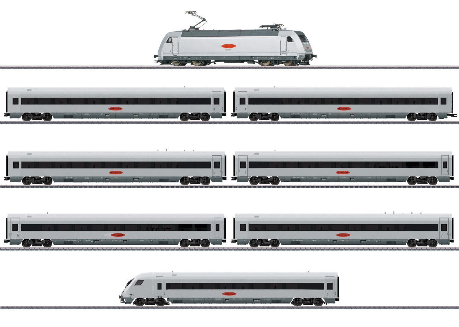 Locomotiva per treni rapidi con Decoder Digital mfx+ ed estese funzionalità sonore. Motorizzazione con regolazione di elevate prestazioni con massa volanica, montata centralmente. 4 assi azionati tramite giunti cardanici. Cerchiature di aderenza. Segnale di testa a tre fanali e 2 fanali di coda rossi, commutati in dipendenza dal senso di marcia, in funzione nel modo tradizionale, commutabili in modo digitale. Faro di profondità e illuminazione della cabina di guida commutabili separatamente in modo digitale. Segnale di testa sulle testate 2 e 1 della locomotiva disattivabile ciascuno separatamente in modo digitale. Funzionalità del fanale a doppia A. Sul lato 2 della locomotiva nell'innesto unificato è inserito un aggancio a 2 poli, quale collegamento elettrico alla carrozza per treni rapidi 1. Tutte le carrozze con illuminazione interna indiretta a LED montata di serie, attenuabile e commutabile in modo digitale tramite un Decoder nella carrozza pilota. Con condensatori di accumulo per lo scavalcamento di brevi punti senza corrente. Carrozza pilota con Decoder Digital mfx. Segnale di testa a tre fanali e due fanali di coda rossi in funzione nel modo tradizionale, commutabili in modo digitale. Faro di profondità, illuminazione della cabina di guida e illuminazione del banco di manovra nella carrozza pilota commutabili ciascuna separatamente in modo digitale. Aggancio conduttore di corrente a 4 poli tra le carrozze per treni rapidi. Illuminazione di locomotiva e carrozze con diodi luminosi esenti da manutenzione (LED) a luce bianca calda e rossi. Carrozza 1 orientata verso la locomotiva con intercomunicante a tampone di gomma. Dettagliata raffigurazione con arredamenti interni multicolori. Commutazione del pattino tra locomotiva e carrozza pilota. Per la completa funzionalità di tutto quanto il treno è prescritta una sequenza dei rotabili definita. Raggio minimo percorribile 360 mm, senza considerazione del profilo di sagoma libera. Per raggi piuttosto grandi, nella zona degli agganci alle estremità delle carrozze la carenatura montata di serie può venire rispettivamente sostituita con una acclusa separatamente. Lunghezza complessiva della composizione di treno ai respingenti circa 236 cm.