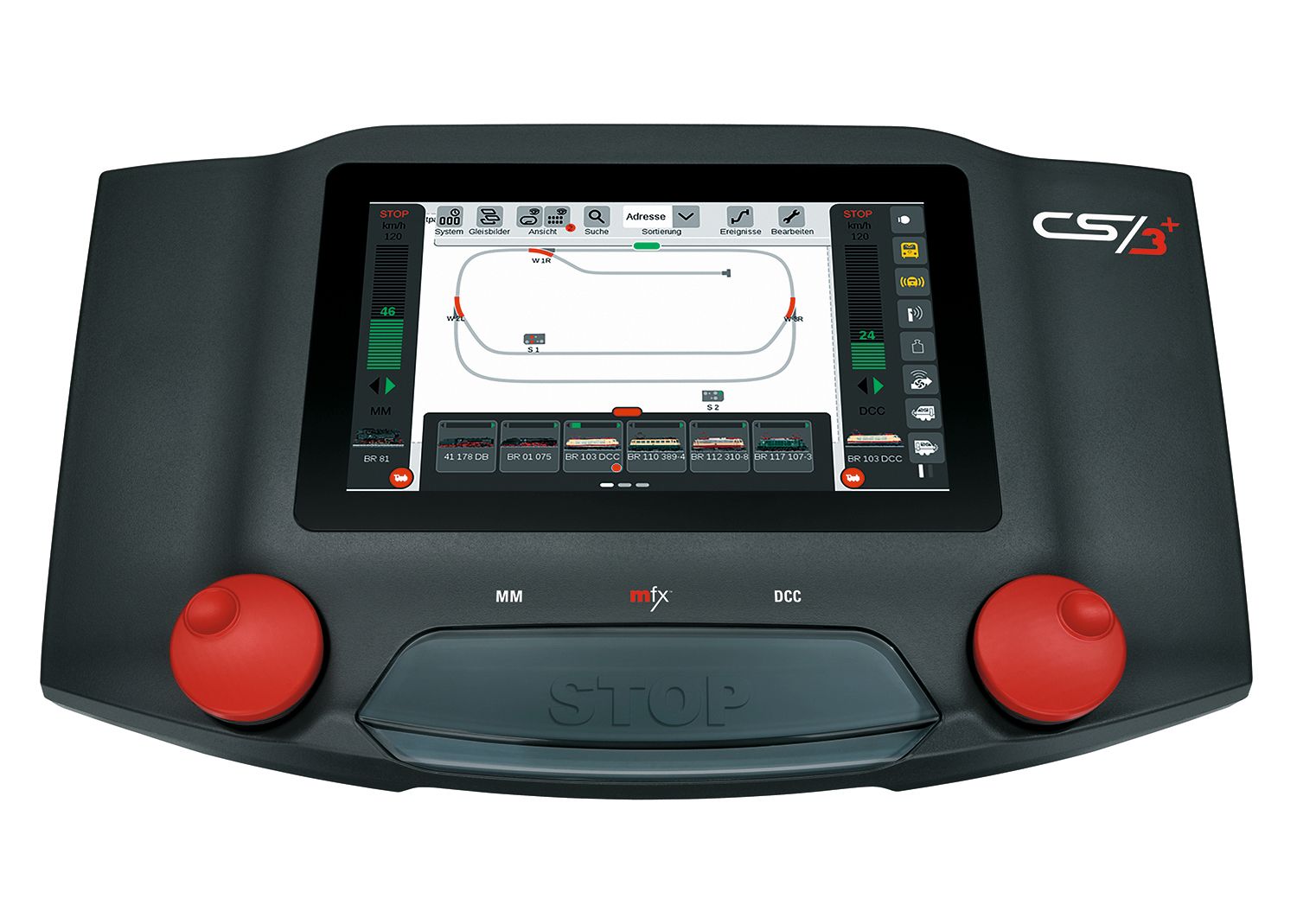 La Central Station 3 plus, in qualità di apparato di controllo multi-protocollo, con il suo moderno schermo a sfioramento a colori di alta risoluzione, i 2 regolatori di marcia nonché il quadro sinottico centrale integrato dei binari, offre la possibilità per il semplice e comodo comando delle locomotive e di tutto quanto l'impianto. Nel caso delle locomotive, si possono commutare sino a 32 funzioni, quanto agli apparati accessori sono possibili sino a 320 articoli elettromagnetici Motorola e risp. 2048 DCC. La Central Station 3 plus dispone inoltre di 2 lettori incorporati di schede da locomotive (per la memorizzazione dei dati delle locomotive su una scheda da locomotive o rispettivamente per il rapido richiamo della locomotiva mediante inserimento della scheda da locomotive), di un innesto per scheda SD per l'ampliamento di memoria nonché di un altoparlante integrato per la riproduzione di tipici suoni della ferrovia in miniatura. Per l'alimentazione dell'impianto con corrente di trazione e di commutazione è integrato un potente Booster. Tale Central Station 3 plus è atta all'uso con numerosi apparati, ossia con il cavetto opzionale (60123) numerose Central Station 3 plus (60216) possono venire messe in funzione insieme su un solo impianto. Dei regolatori di marcia aggiuntivi, ulteriori Layouts e Keyboards completano l'azionamento dell'impianto, laddove configurazioni comuni o separate per le zone dell'impianto da comandare possono venire mantenute nella Central Station 3 plus. La Central Station 3 plus dispone di una connessione integrata s88, 2 interfacce USB incorporate (ad es. per mouse, tastiera, penna USB), una presa USB di ricarica, una connessione da rete per la comunicazione con un PC, connessioni per 2 Mobile Stations, una connessione per altoparlante esterno nonchè di ulteriori per il sistema Märklin-Bus. Capacità di carico al binario di alimentazione: max. 5 A, capacità di carico al binario di programmazione: max. 1,2 A. La Central Station 3 plus si deve utilizzare soltanto in abbinamento con l'alimentatore "switching" da rete 60061 (60101 per lo scartamento 1 e L51095 per LGB) e non con i trasformatori come ad es. 60052. In caso di impiego dell'alimentatore "switching" da rete 60061 si ottiene una massima potenza di uscita di 58 VA ed una massima corrente di 3 A (in caso di 60216 con alimentatore "switching" da rete 60101/L51095 si ottiene una massima corrente di 5 A, consigliata esclusivamente per lo scartamento 1/LGB. Si prega assolutamente di prestare attenzione alla sezione trasversale del cavo, più grande di 0,5 mm²!). Dimensioni 320 x 195 x 80 mm.
