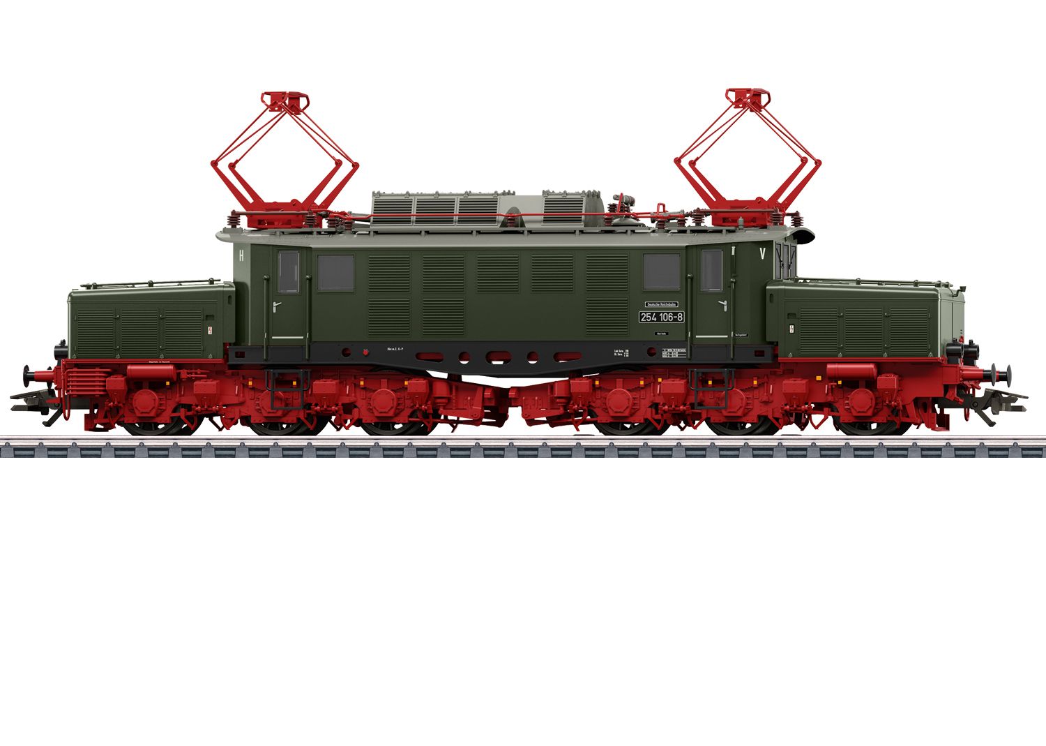 Prototipo: Pesante locomotiva elettrica per treni merci Gruppo 254 della Ferrovia Tedesca del Reich della DDR (DR/DDR). Colorazione di base verde bottiglia con telaio nero e carrelli rossi. Numero di servizio della locomotiva 254 106-8. Condizioni di esercizio attorno al 1989.