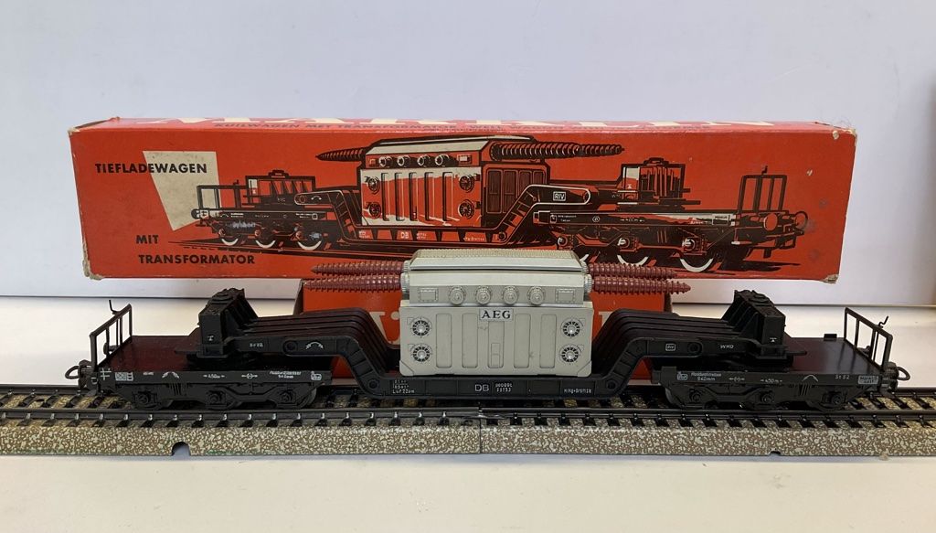 Modello: Carro merci ribassato per carichi pesanti con trasformatore. 6 assi, nero. Lunghezza cm. 25
