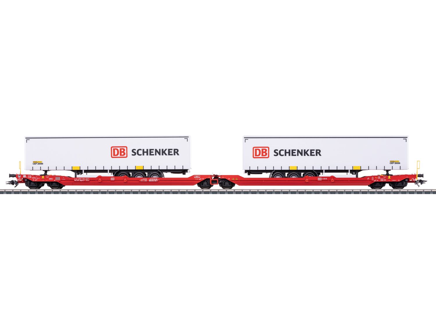 Prototipo: Carro a tasca doppio a 6 assi con articolazione, del tipo costruttivo Sdggmrss 738 (T3000e) della Ferrovia Tedesca S.p.A.(DB AG). Moderno carro di supporto per il trasporto combinato di carichi. Colorazione di base rosso trasporti. Esecuzione con due catenacci laterali ribaltabili. Condizioni di esercizio dal 2013. Caricato con due rimorchi articolati a sella con tendoni a cortina laterale dello spedizioniere DB Schenker.