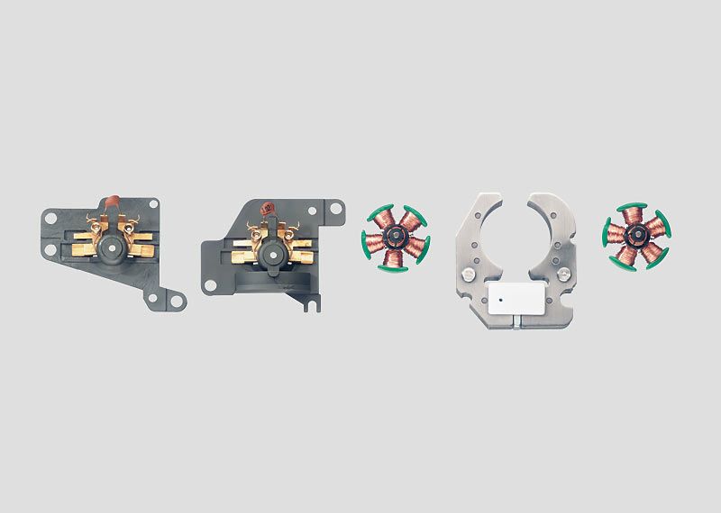 This set is for upgrading many Märklin H0 locomotives with larger design flat-style commutator motors to the five-pole, high-efficiency motor. The set consists of a high-efficiency motor in different