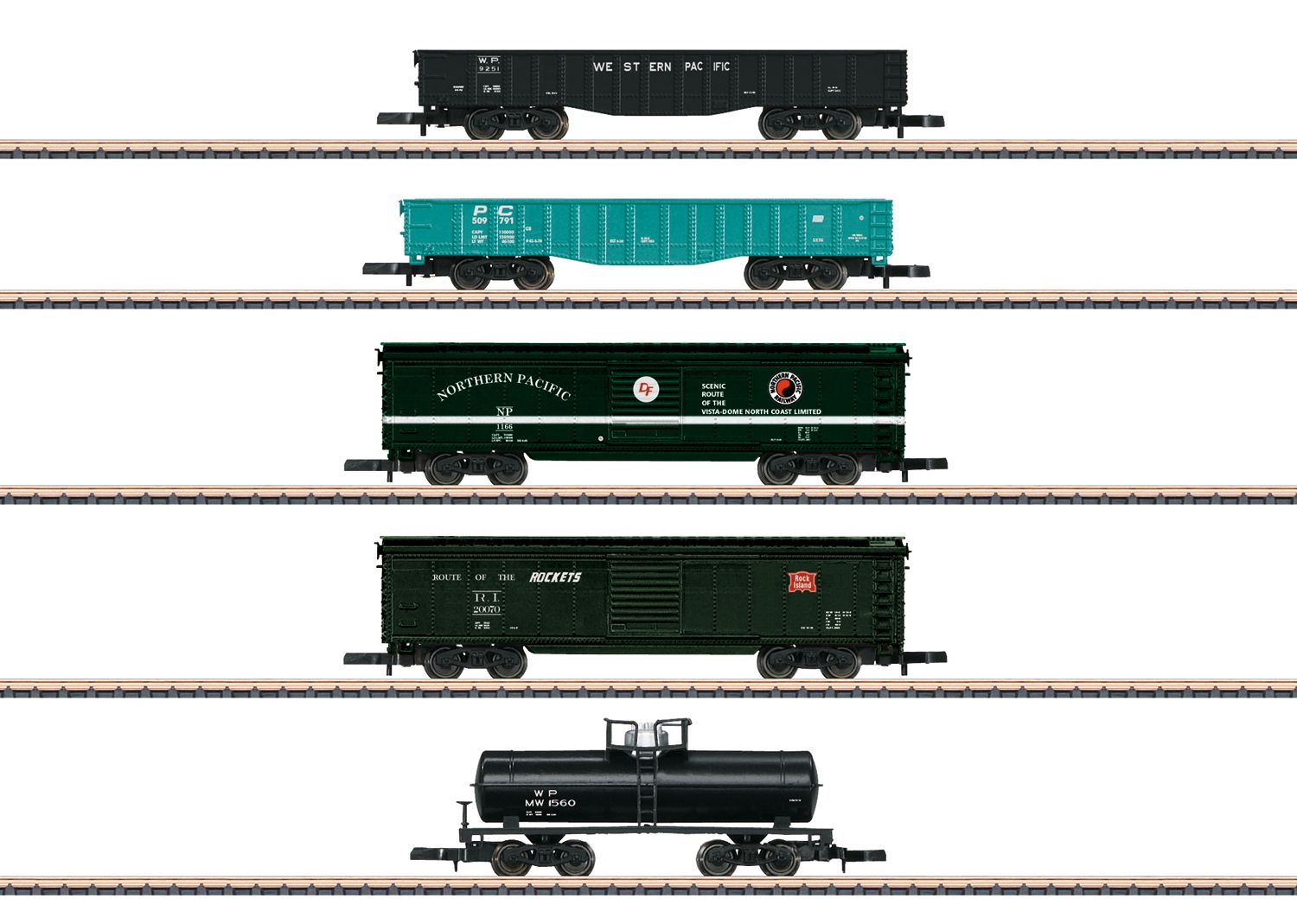 Prototipo: 5 differenti carri merci US, 2 Gondola della Western Pacific e Penn Central, 2 Box-Car della Northern Pacific e rispett. della Rock Island ed 1 Tank-Car della Western Pacific nelle condizioni verso l'Epoca IV.