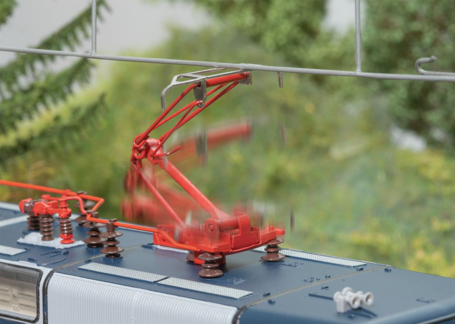 Con Decoder Digital mfx+ ed estese funzionalità sonore. Motore di elevate prestazioni a 5 poli con massa volanica, montato centralmente. Tutti i quattro assi azionati tramite giunti cardanici. Cerchiature di aderenza. Segnale di testa a tre fanali e due fanali di coda rossi commutati secondo il senso di marcia, in funzione nel modo tradizionale, commutabile in modo digitale. Segnale di testa sulle testate 2 e 1 della locomotiva disattivabile ciascuno separatamente in modo digitale. Illuminazione della cabina di guida commutata secondo il senso di marcia e illuminazione del comparto macchinari commutabili in modo digitale. Illuminazione con diodi luminosi esenti da manutenzione (LED) a luce bianca calda e rossi. Pantografi sollevabili e abbassabili in modo digitale. Riproduzioni delle ruote, mancorrenti, tergicristalli, prese ad innesto UIC e condutture sul tetto riportati separatamente. Altezza dei respingenti a norme NEM. Condutture del freno, agganci a vite e svariate prese ad innesto sono acclusi come componenti innestabili separatamente. Lunghezza ai respingenti circa 20,6 cm.